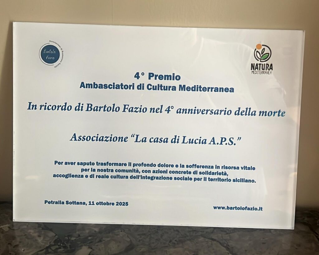 L’11 ottobre, al Parco Avventura delle Madonie di Petralia Sottana (PA), nell’ambito del progetto “Natura Mediterranea – Qualità, sostenibilità e salute”, la Casa di Lucia A.P.S. ha ricevuto il 4° Premio “Ambasciatori di Cultura Mediterranea”, in ricordo di Bartolo Fazio. Un riconoscimento che ci onora e ci commuove profondamente, perché parla di ciò che ci muove ogni giorno: la cura delle relazioni umane, la solidarietà, la giustizia sociale e la costruzione di una reale cultura dell’incontro.